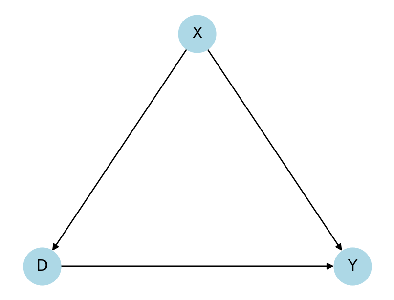 \[ \begin{align*} Y &= \theta_0 D + \beta X + \gamma_1 U + \epsilon,\\ D &= \delta X + \gamma_2 U + \nu, \end{align*} \] with \(\epsilon\) and \(\nu\) being uncorrelated error terms and \(\theta_0\) corresponds to the average treatment effect of the (continuous) treatment \(D\) on \(Y\).